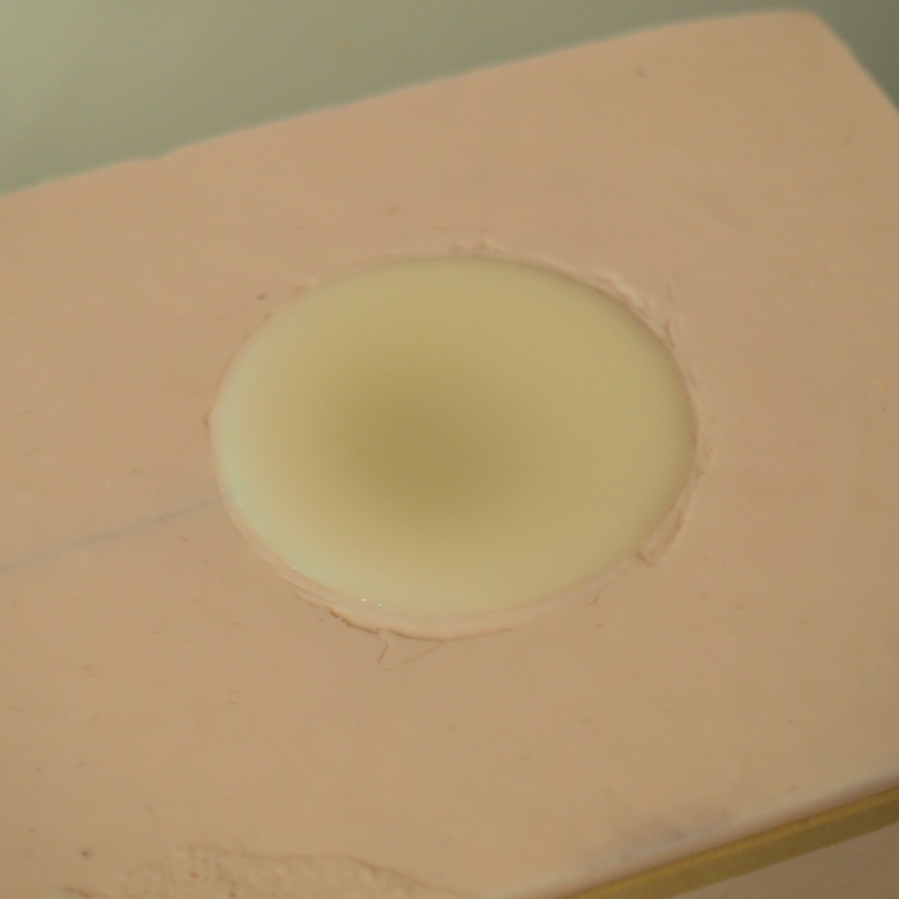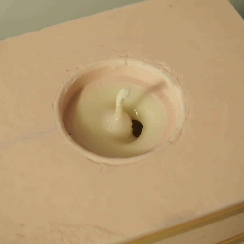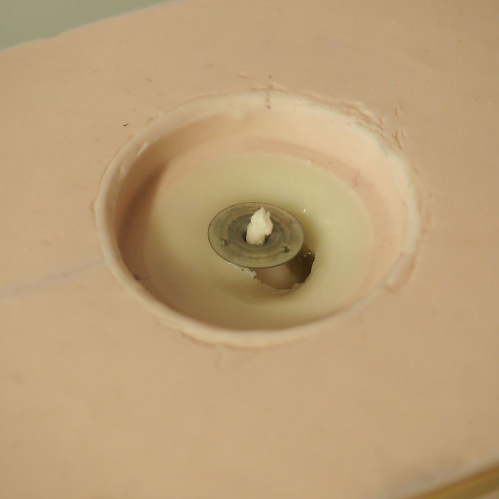Sinkholes during the candlemaking process - This should only occur when the mould opening is small (2" or smaller like the one in the photos below). Since the exposed surface is so small, it hardens too quickly before trapped air can escape. Candles with a larger base (bigger mould opening) should not experience this issue, as it takes longer for the surface to harden, therefore giving enough time for trapped air to escape.